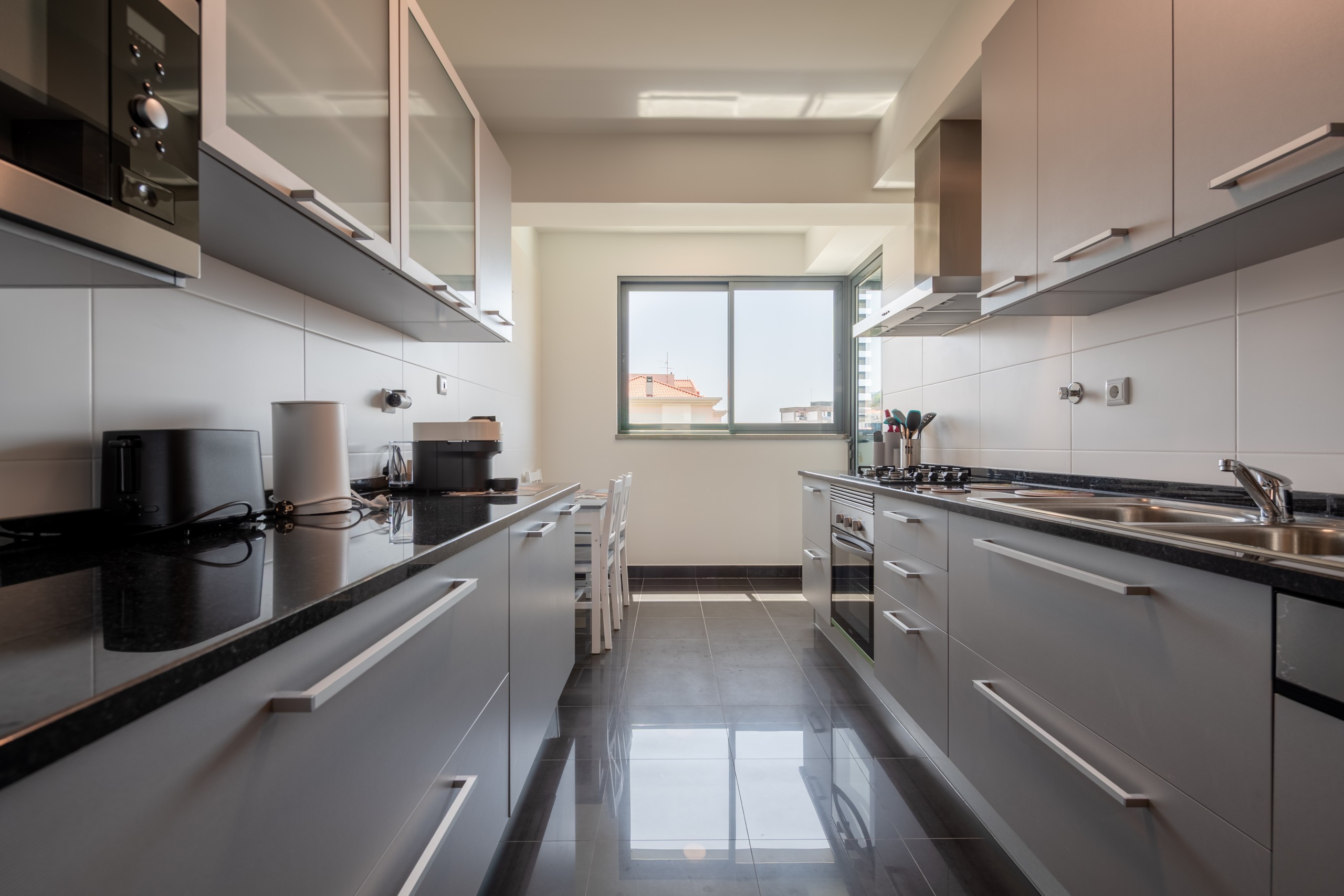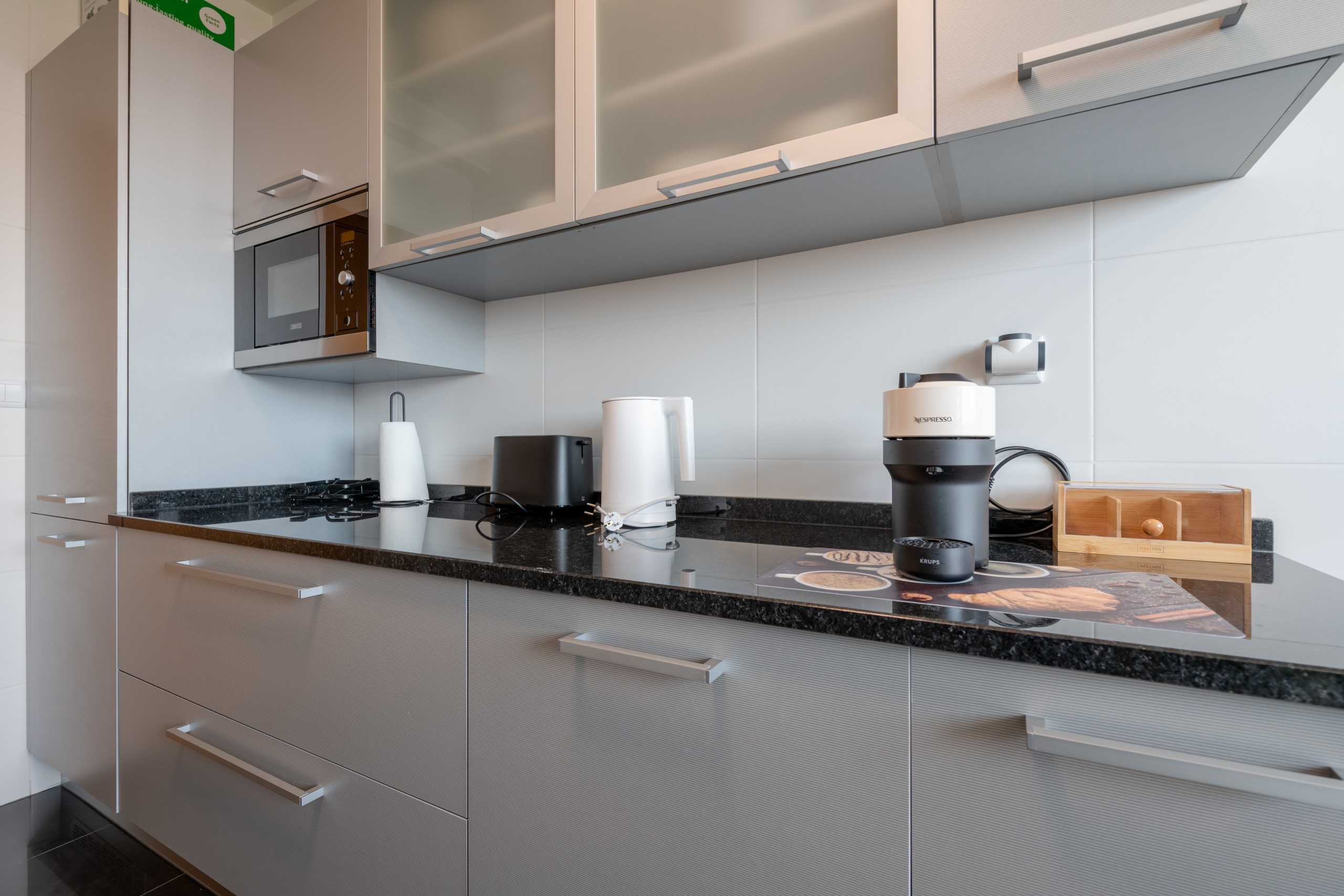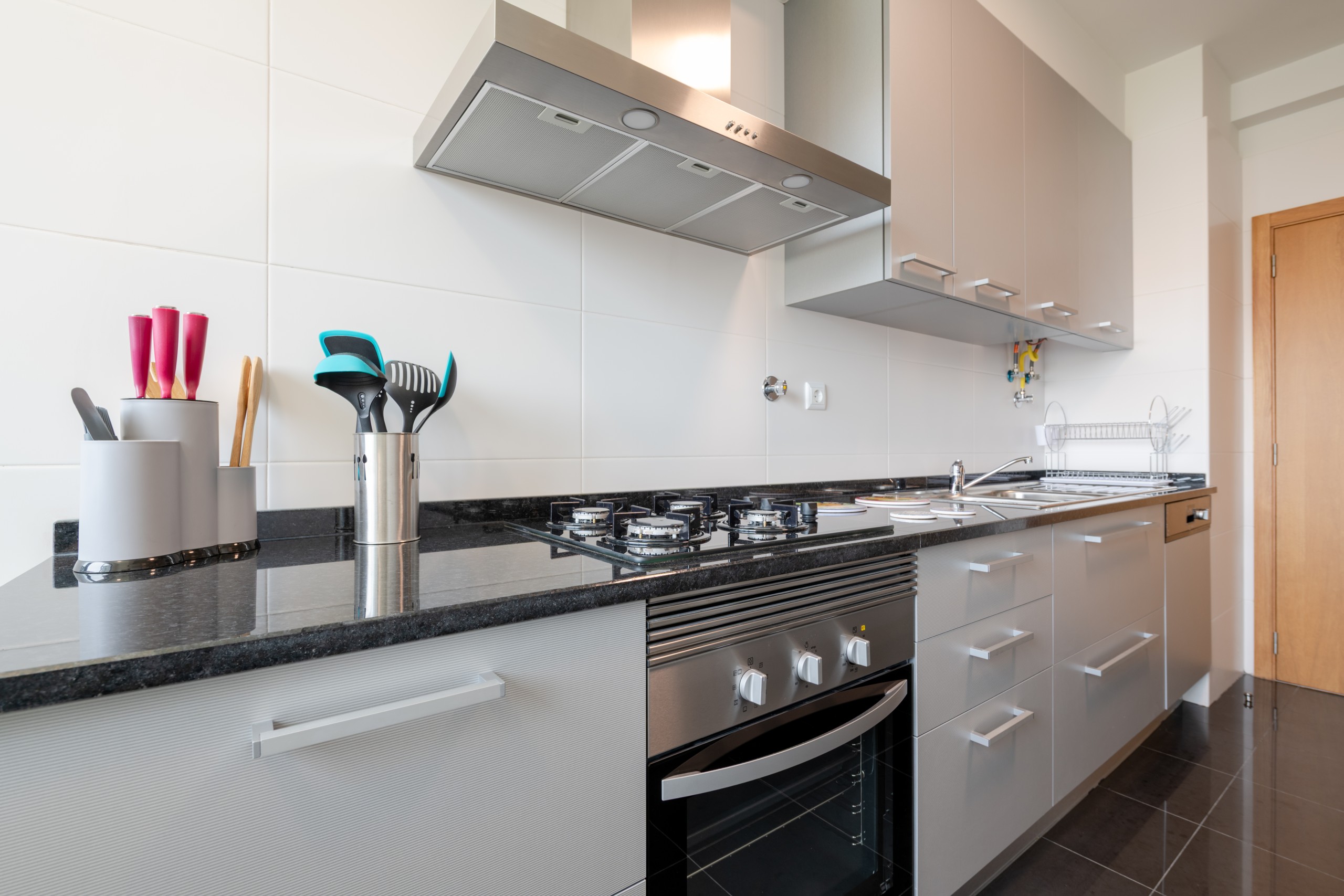 Uma cozinha moderna com tudo o que precisa para cozinhar e desfrutar de refeições em casa.