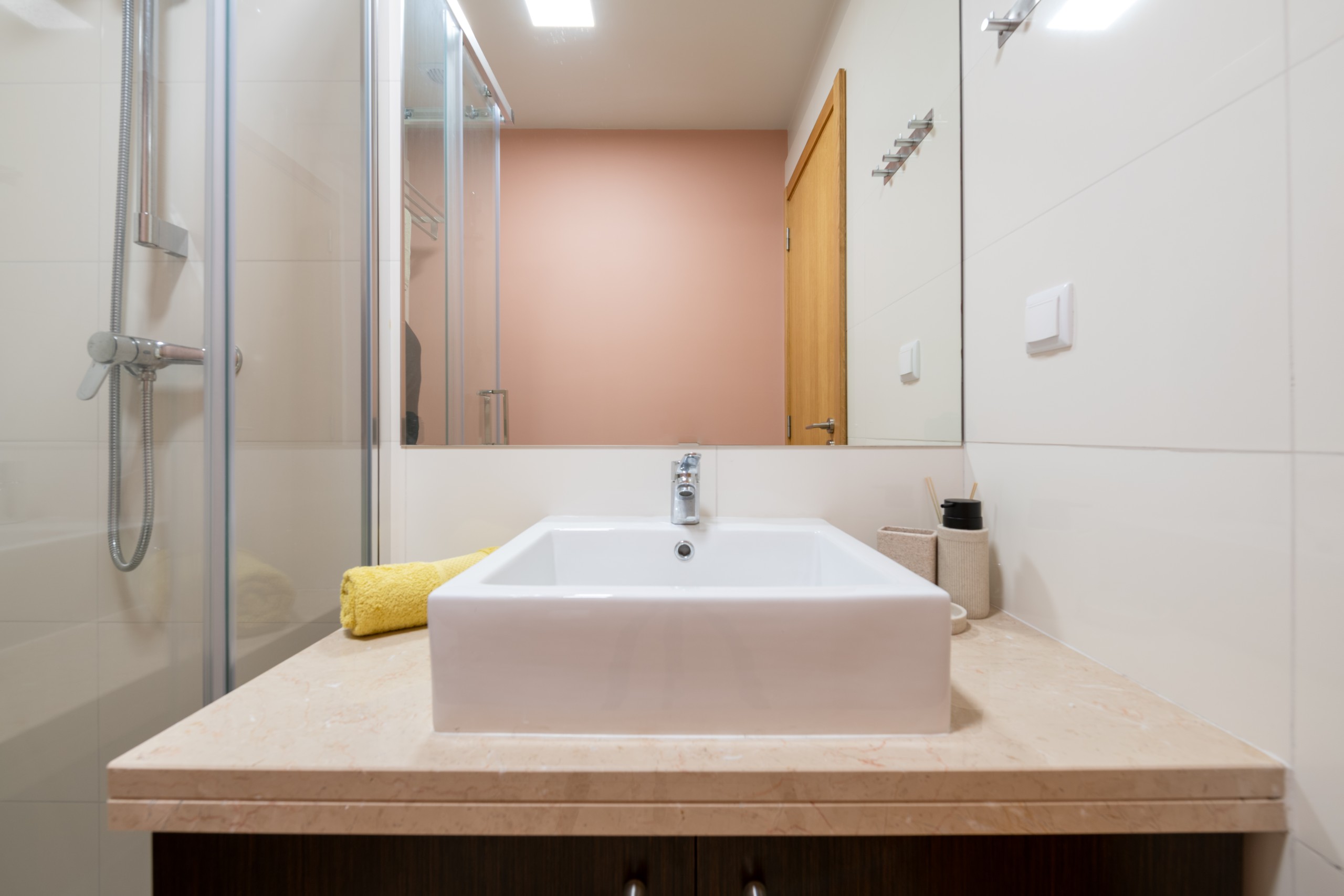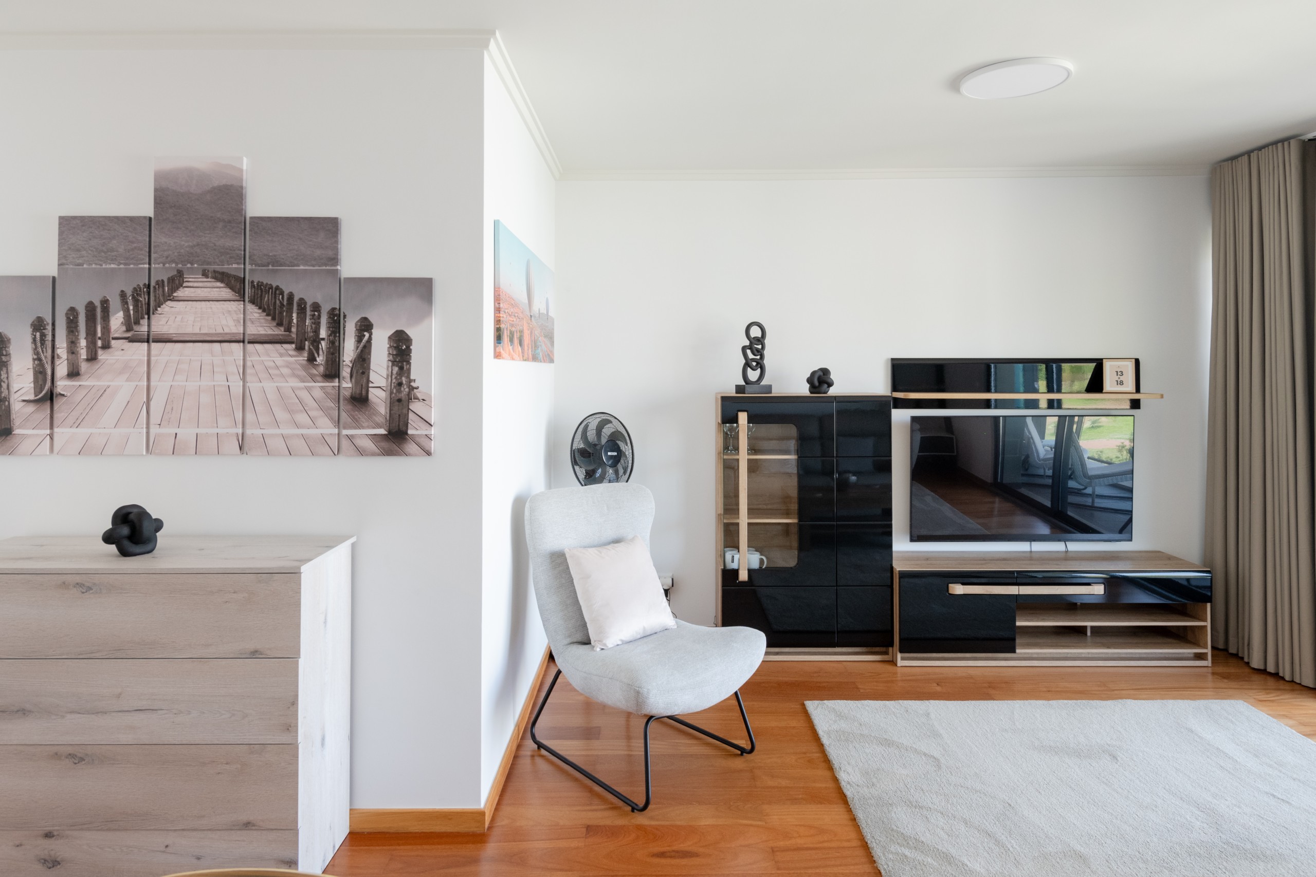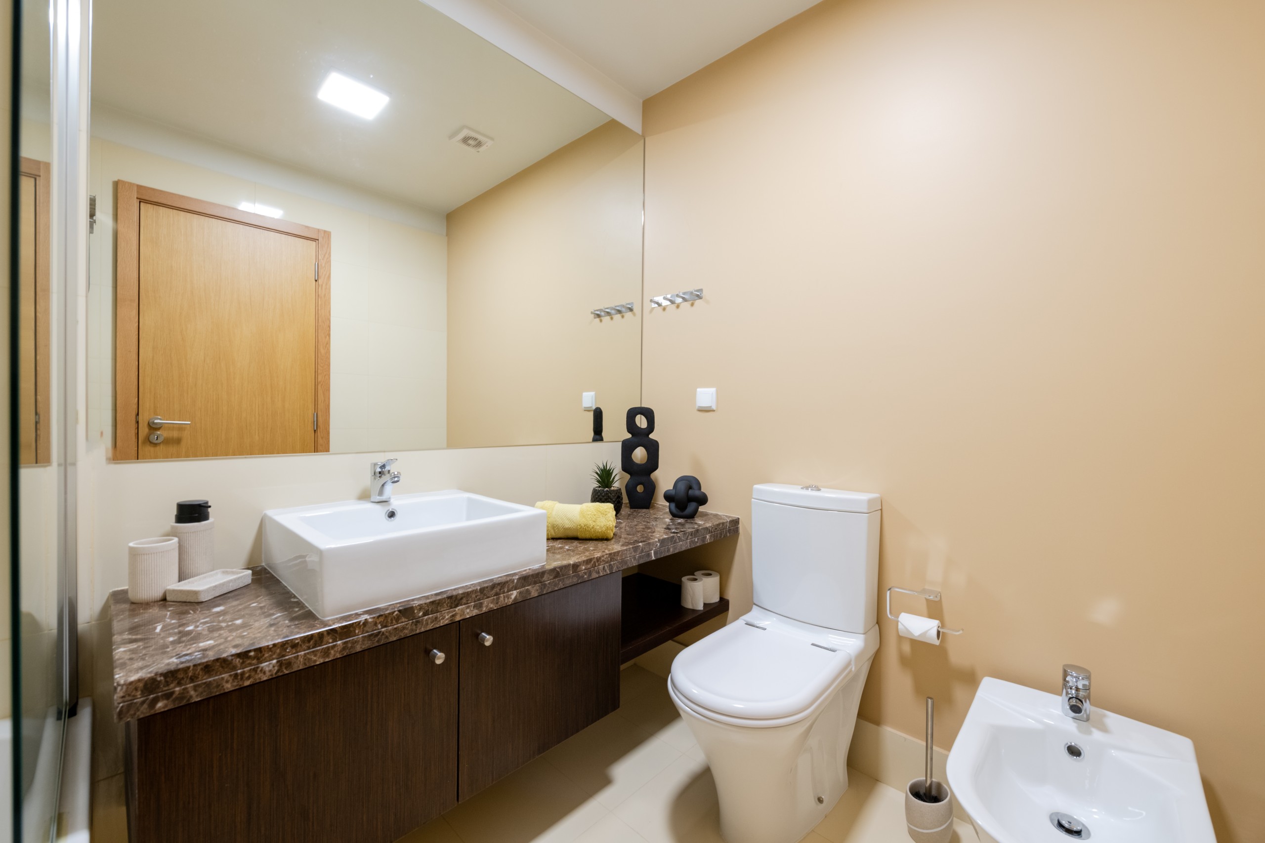Dois quartos elegantes, um deles com casa de banho privativa.