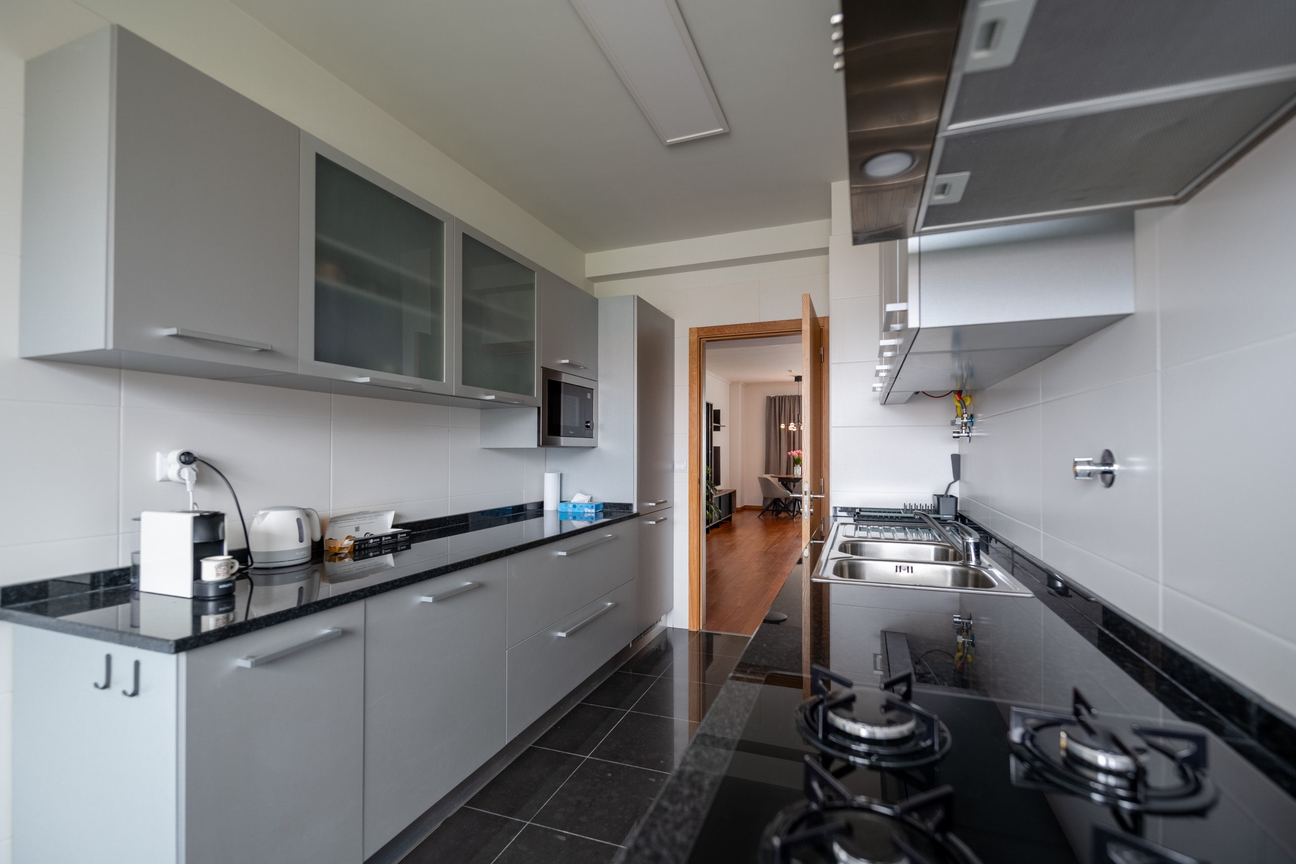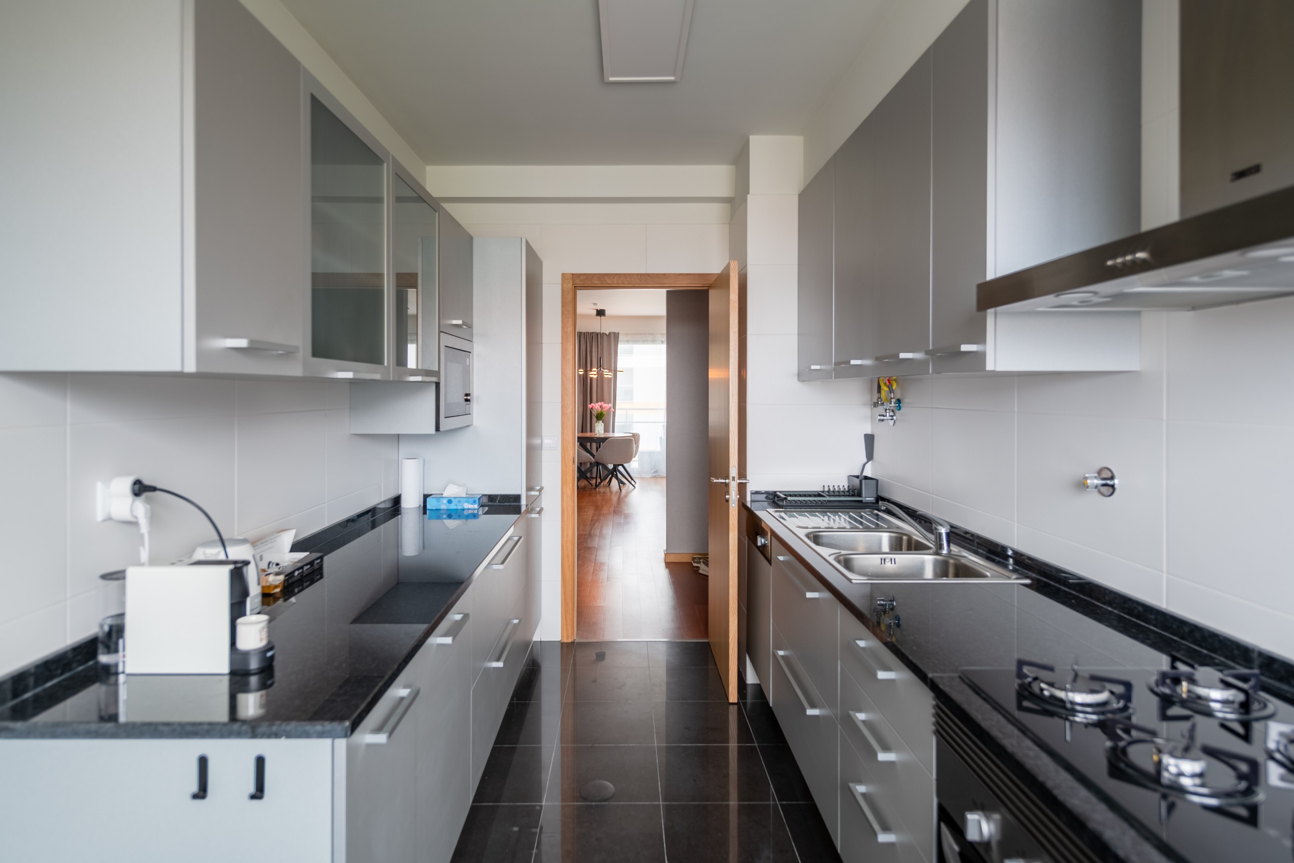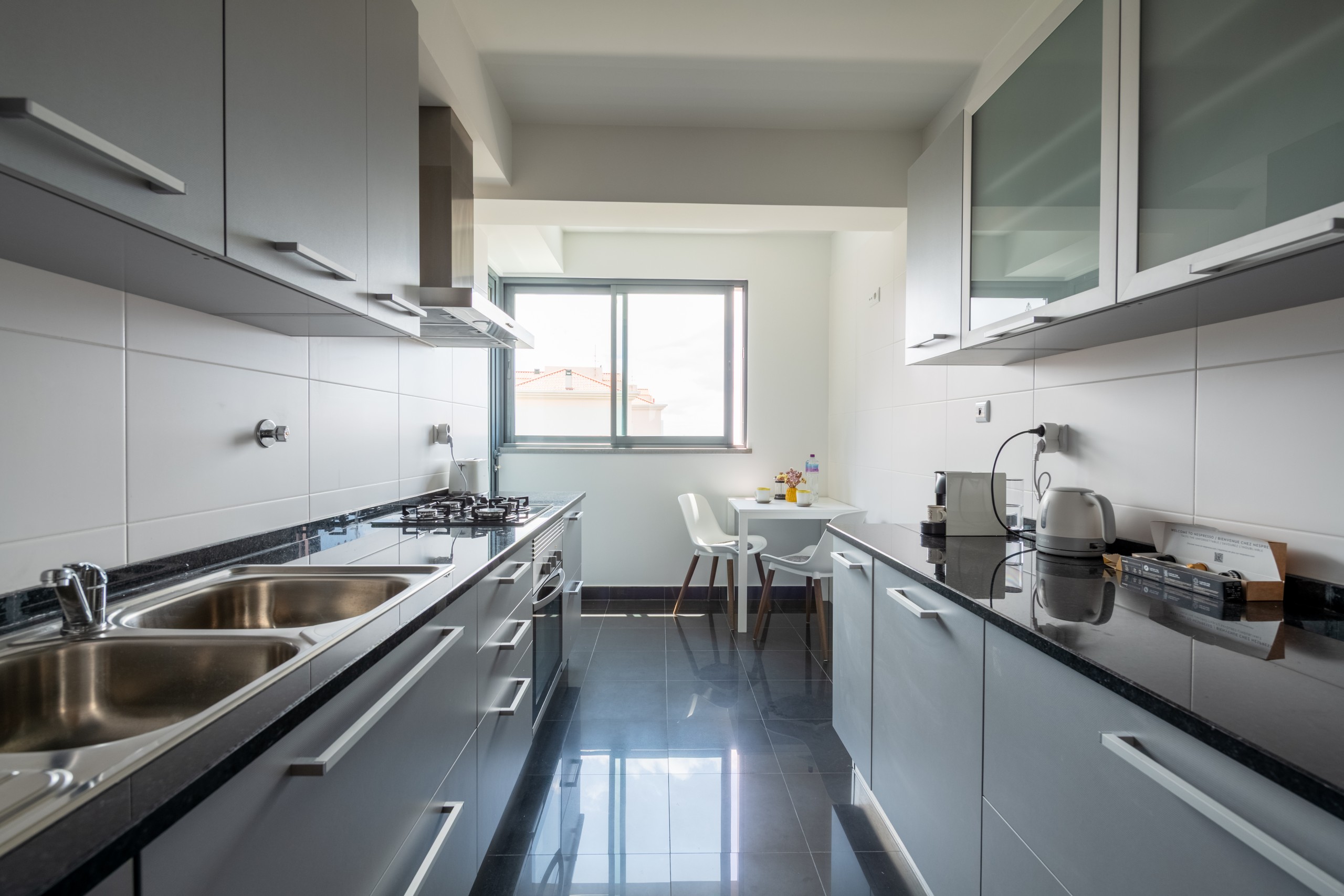 Cozinha totalmente equipada com máquina de lavar loiça e máquina de lavar roupa.